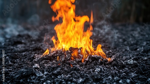 flames, ash, smoke, heat, mystery, sorrowful, warmth, ember, texture, fire, contrast, darkness, decay, solitude, reminiscence, nature, environment, transformation, memory, glow, atmospheric, element, stillness, drama, abstract, choreography, intense, enchantment, evolution, energy, life, remnant, surreal, shadow, calmness, spirituality, quiet, softness, earthy, organic, poetic, ambience, introspection, narrative, fragility, fleeting