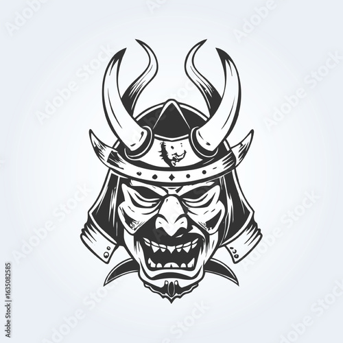 a flat illustration of a samurai mask, an oni helmet, an angry face, and long teeth