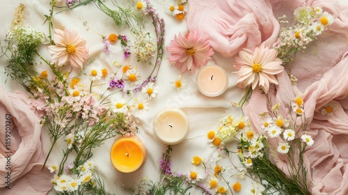 A flat lay of a table with spring flowers scattered across, alongside spring-themed decor like candles and soft textiles.