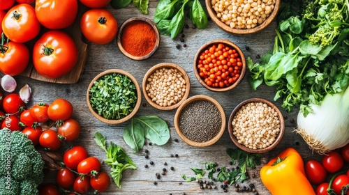 vegan, food, arrangement, wooden, surface, spice, bowl, top, view, overhead, herb, flat, lay, spice, vegetable, wood, vegetable, grain, condiment, background, ingredient, ingredient, tomatoes, grain, green, rustic, table, seasoning, fresh, healthy, organic, cooking, closeup, nourishment, natural, texture, colours, brown, red, yellow, seed, leaf, plant, raw, pepper
