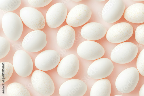 A flat lay of many speckled white eggs on a pale pink background. Perfect for Easter, spring, or food blogs.