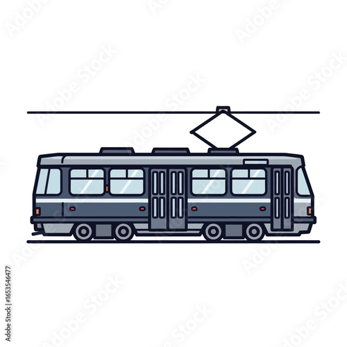 tram, streetcar, streetcar, train, rail, railway, railroad, vehicle, transport, transportation, transit, commute, commuter, passenger, public, urban, city, municipal, subway, locomotive, carriage, car, wagon, wheel, window, door, pantograph, wire, line, cable, electric, electricity, power, overhead, track, railcar, illustration, vector, icon, symbol, graphic, design, drawing, cartoon, flat, simple, minimalist, clean