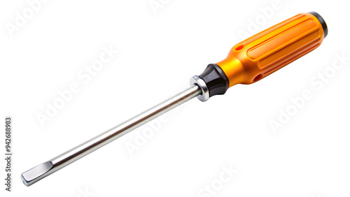 A flat-head screwdriver with a shiny metal shaft and an ergonomic orange and black handle, designed for a firm grip and precision, on a transparent background