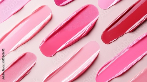 A flat-lay of glossy Cool Pink lip gloss swatches, arranged in a sleek, modern pattern on a pastel background.