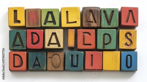 wooden, alphabet, block, bright, primary, colours, arranged, letter