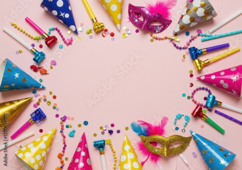 A flat-lay photograph features a light pink background scattered with colorful party supplies, suggesting a festive celebration or event invitation.