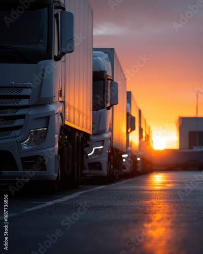 A fleet of cargo trucks lined up for inspection at a logistics hub in early morning light