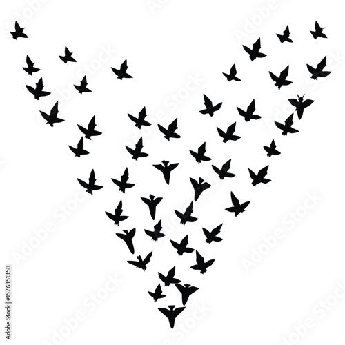 bird, flying, flock, v, formation, silhouette, animal, wildlife, nature, freedom, migration, sky, white, background, isolated, movement, travel, wing, wing, flight, avian, creature, symbol, peace, harmony, together, group, teamwork, leadership, direction, journey, outdoors, air, atmosphere, black, shape, outline, pattern, abstract, minimalist, clean, simple, graphic, design, illustration, vector, art, symbolic, concept