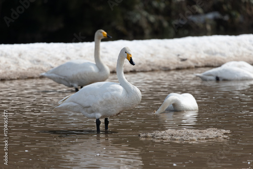 cygnet, migratory, whooper, white swan, snow, cold, duck pond, wild, winter, sunny, resting, standing, eat, reservoir, water, flock, wintering, nature, water bird, birding, japan, asia, rural, countryside, muddy, beauty, grace, scenic, bird, animal