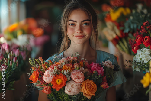 A florist arranging a bouquet in a cozy flower shop. A scene of inspiration and beauty