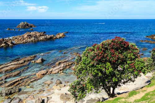 sea, coast, tree, beach, water, landscape, new zealand, blue, ocean, nature, summer, sky, coastline, travel, rock, nz, rock, shore, beautiful, view, sand, rocky, scenic, stone, scenery, flowering, flower, coastal, blossom, red, island, seascape