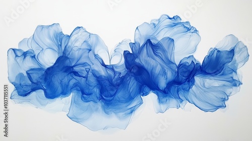 A flowing abstract design featuring rich blue hues and ethereal fabric-like textures, creating a sense of motion and tranquility.