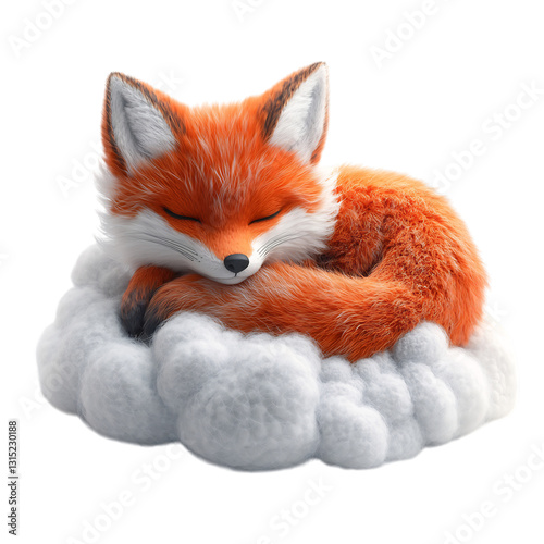 A Fluffy 3D Fox with a Soft Fluffy Tail Sleeping on a Cloud Isolated on Transparent Background