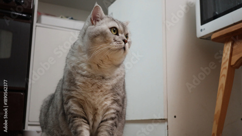 cat, felino, pet, animal, tabby cat, green eye, attentive, observant, animal portrait, mammal, home, living room, kitchen, furniture, animal welfare, animal kingdom, animal world, animal rights