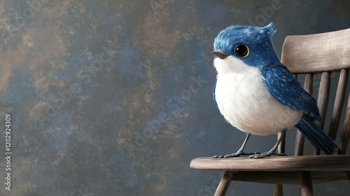 A fluffy, cartoon-style bird with a bright blue head and white body sits on a perch.