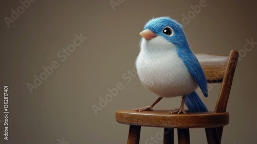 A fluffy, cartoon-style bird with a bright blue head and white body sits on a perch.