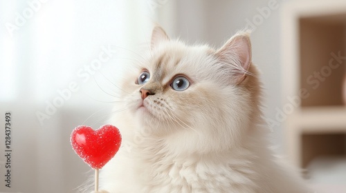 A fluffy cat gazes at a red heart-shaped lollipop, embodying curiosity and sweetness in a warm, softly lit setting.
