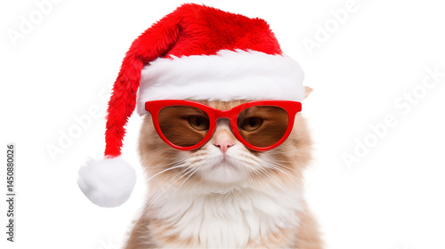 A fluffy cat wearing a santa hat and red sunglasses for christmas time isolated on transparent background
