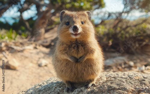 A fluffy quokka smiling on a rocky island