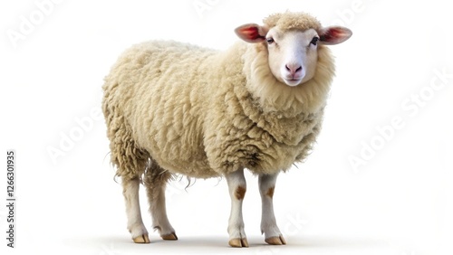 A Fluffy Sheep Standing Against a Pure White Background, Its Fleece Thick and Luxuriant, Displaying a Gentle and Docile Expression