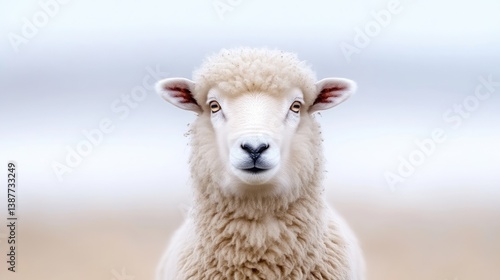 A fluffy white sheep stares directly at the camera. Its fleece is thick and creamy. The background is blurred, showing a pale sandy beach. The image is high-quality, with soft lighting. A serene and