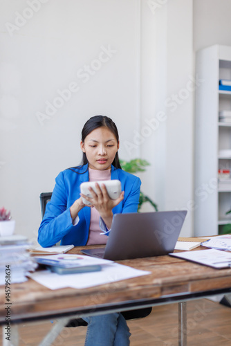A focused asian woman accountant analyzing paperwork while calculating expenses using laptop and calculator at her office desk.