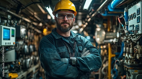 industrial, men at work, machinery, equipment, maintenance, safety, protection, repair, operation, professional, focused, skilled, expertise, technical, engine, power, system, facility, control, panel, electrical, mechanical, part, component, pipe, cable, environment, precision, detail, uniform, serious, confident, dedicated