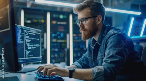 A focused male programmer works late at night in a data center, illuminated by the blue glow of server racks. He is typing on a keyboard, concentrating on the code displayed on his monitor