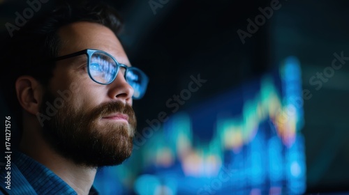 A focused man with glasses analyzes stock charts on a computer screen, illuminated by colorful market data in a modern setting