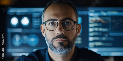 A focused man with glasses stands before multiple data-filled screens, immersed in analysis with graphs and codes in a dimly lit technological environment.