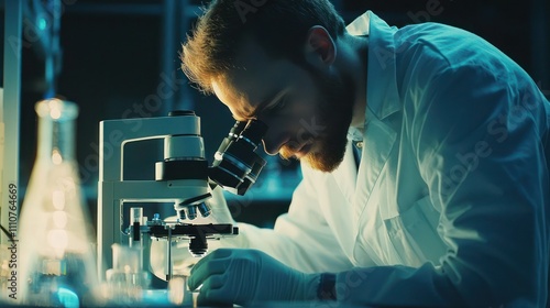 A focused scientist using a microscope, deeply engaged in their research work
