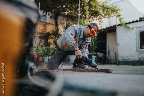 men at work, grinder, yard, metal, cutting, spark, tool, machine, construction, equipment, manual, labor, safety, clothing, boot, glove, kneeling, sharpened, concentration, job site, residential, home, project, metalwork, durability, engineering, industry, craft, precision, surface, grinding, metal plate, dust, hardware, material