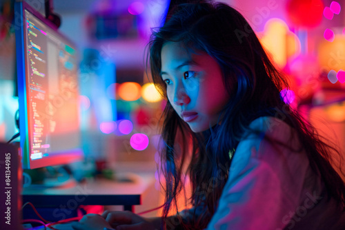 A focused young girl codes on a computer, bathed in vibrant, colorful lights that evoke creativity and innovation