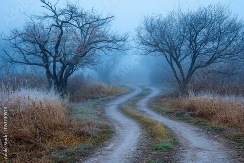 A foggy landscape with a winding dirt path between bare trees and tall grass.