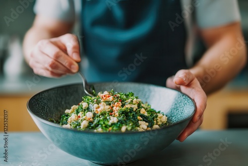 A food influencer focused on branding, marketing, and promotions. Fresh salad being served in a stylish bowl by a chef.