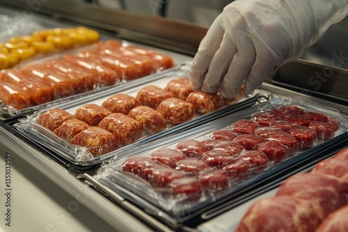 A food packaging facility worker sealing fresh products under sterile conditions, ensuring hygiene, quality control, and compliance with safety regulations.