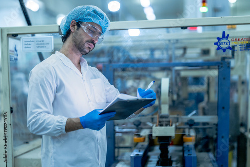 A food processing supervisor wearing protective gear and holding a clipboard, inspecting operations between machinery in a factory, emphasizing hygiene, safety, and quality control in production