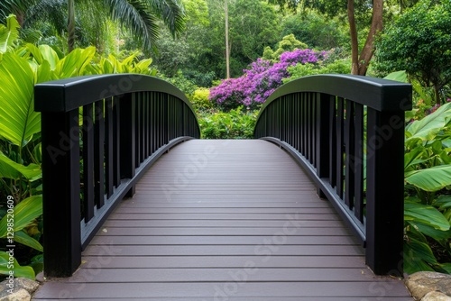 A footbridge in a botanical garden, surrounded by exotic flowers and trees