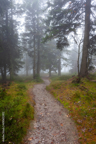 A footpath winds through the misty forest. The drenched path leads through blueberry bushes and misty fir trees.