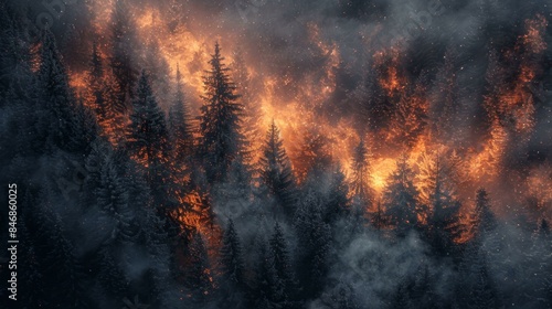 A forest fire is burning in the woods, with trees and smoke visible in the image.