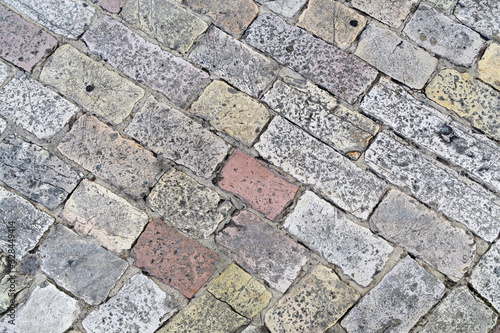 A fragment of an old cobblestone pavement lined with multi-colored rectangular bricks. Close-up. Background. Pattern.