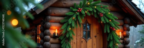 A fragrant fir wreath crowns the arched entrance to a cozy cabin, evergreen, branch