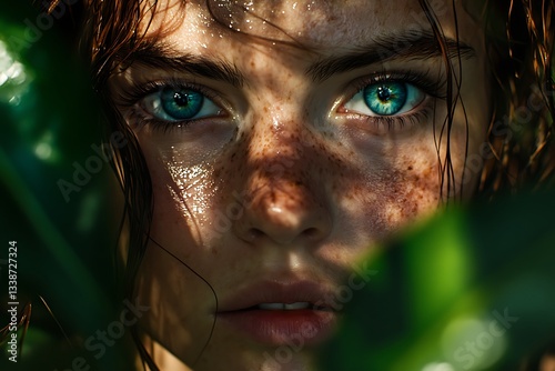 girl, portrait, freckle, blue eye, green leaf, foliage, sunlight, natural light, shadow, closeup, captivating, mystery, vibrant, beauty, raw, allure, verdant, background, blurred, dappled, skin, face, missy, teenage girl, summer, nature, outdoors, intense, enigmatic, serene, peaceful, mysterious, hidden, looking, expression, emotion, sharpened, contrast, shadow, light, green, leaf, plant, photo