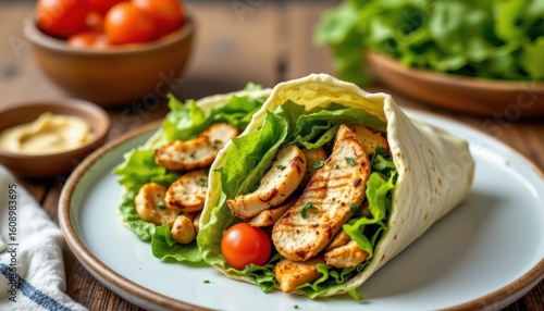a fresh and colorful wrap with grilled chicken, romaine, and no grains, perfect for blood type o diet, clean minimal plate