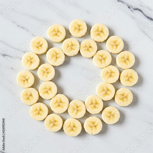a fresh banana sliced into pieces and arranged in a circular pattern on a marble surface