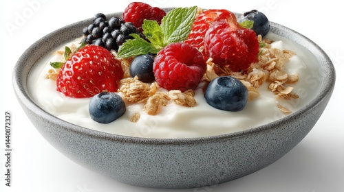 a fresh bowl of creamy yogurt topped with granola and fresh berries on a white isolated background, healthy and delicious design