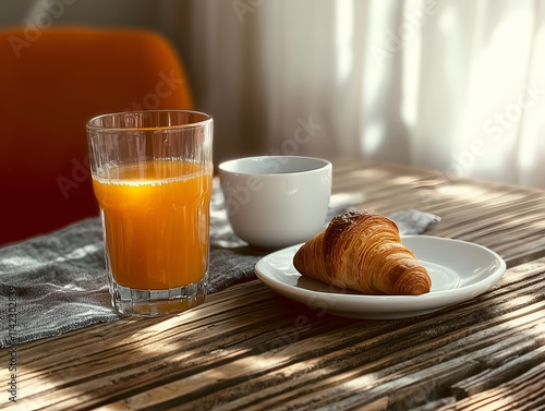 breakfast, croissant, orange juice, cup, plate, wooden table, morning, sunlight, food, drink, fresh, pastry, snack, rustic, hot drink, cosy, simple, casual attire, healthy, natural, refreshment, morning light, relaxing, kitchen, home, dining, delicious, warm, minimal, inviting, meal, traditional, baked, calm, soft light, brunch, tasty, peaceful, table setting, simplicity, elegant, beverage, lifestyle