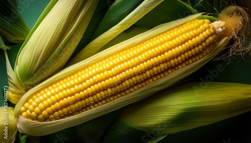 a fresh ear of corn with vibrant yellow kernels surrounded by green leaves