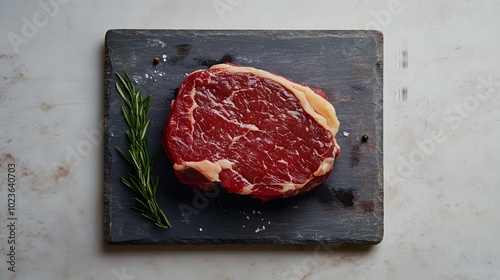 A fresh, marbled steak sits on a slate board, accompanied by a sprig of rosemary, highlighting its quality and flavor potential.