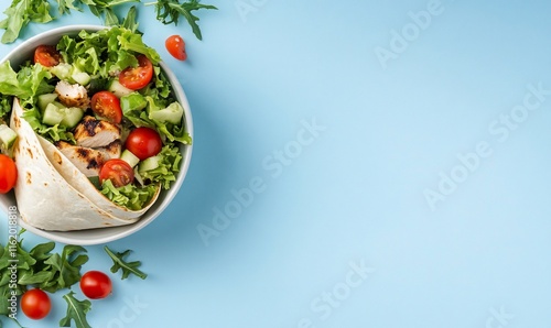 A fresh salad bowl with grilled chicken and cherry tomatoes on a blue background.